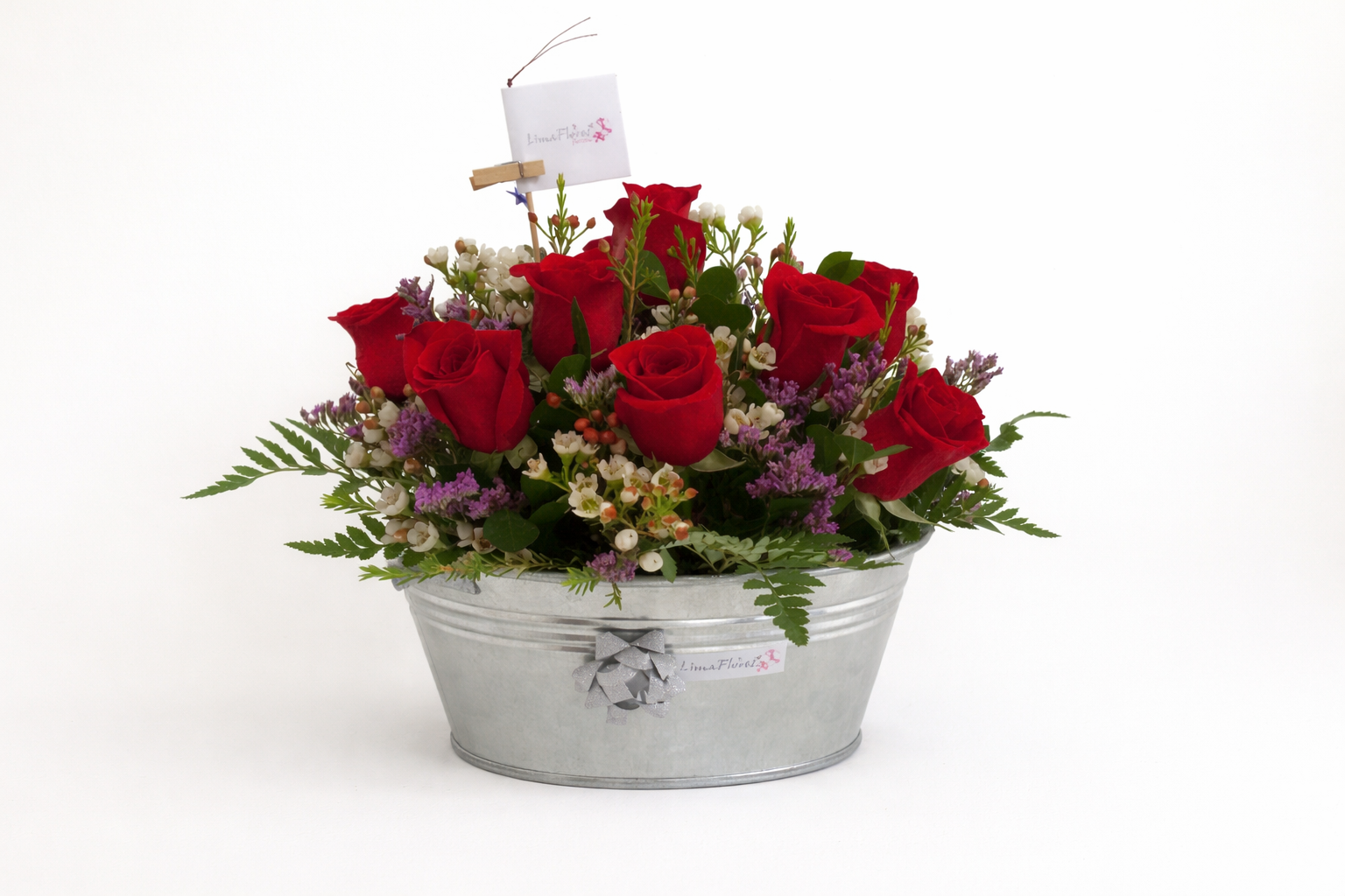 Latón con 12 rosas rojas, toque blancos, morados y follaje verde, Incluye una tarjeta con la dedicatoria