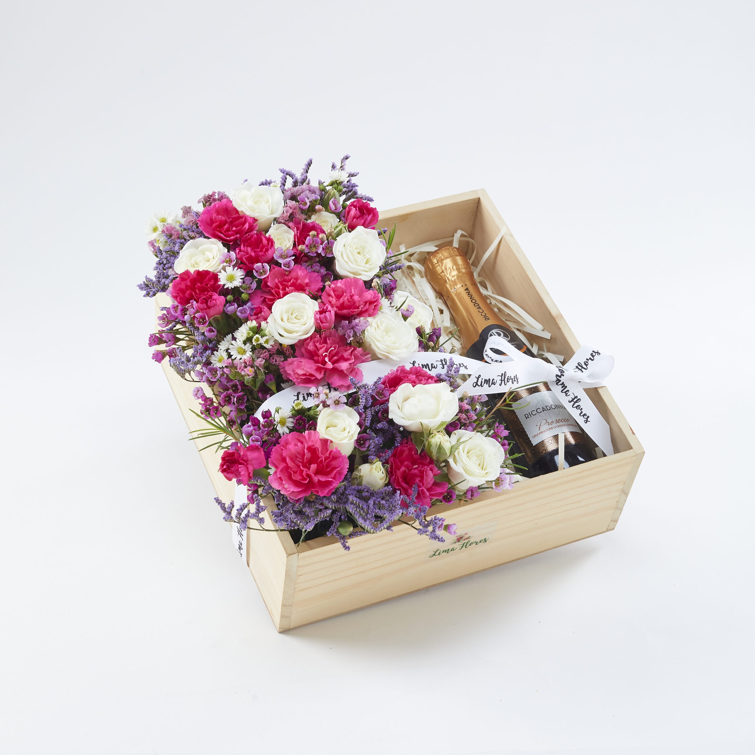Box de madera con una combinación de flores como mini rosas, claveles, toques morados. Incluye copa falauta de vidrio y una botella de Riccadona de 200 ml.