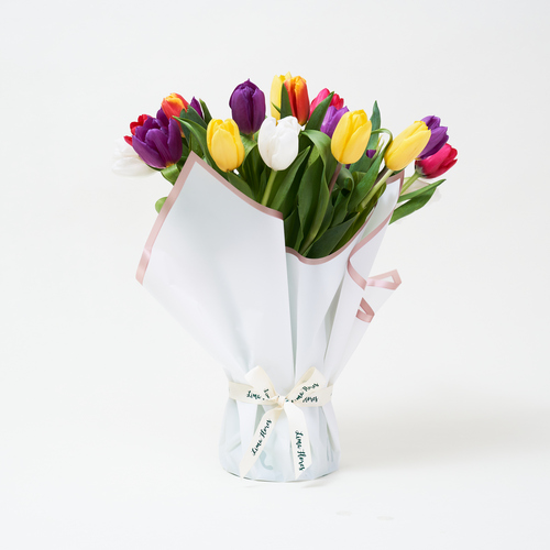Florero de vidrio con 20 tulipanes de colores. Ademas , incluye una tarjeta con la dedicatoria. Es el regalo perfecto.