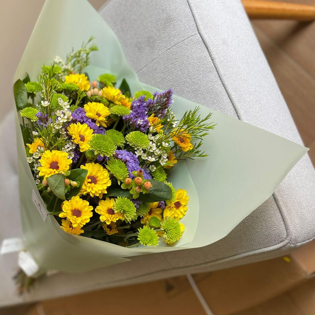 Ramo de flores con mini rosas naranjas, siemprevivas moradas, pompones verdes y toques amariloos,acompañados con folaje verde.