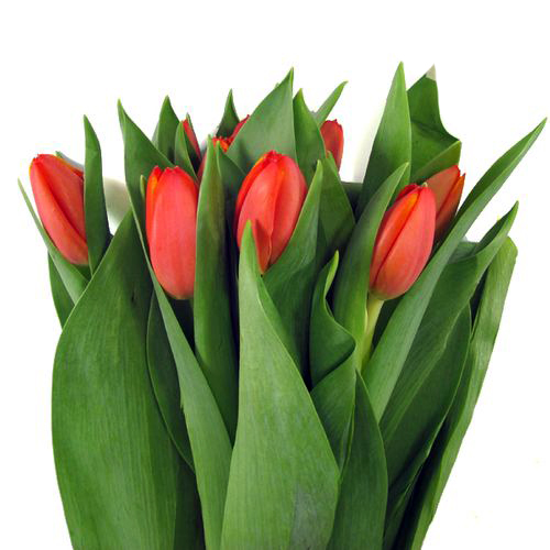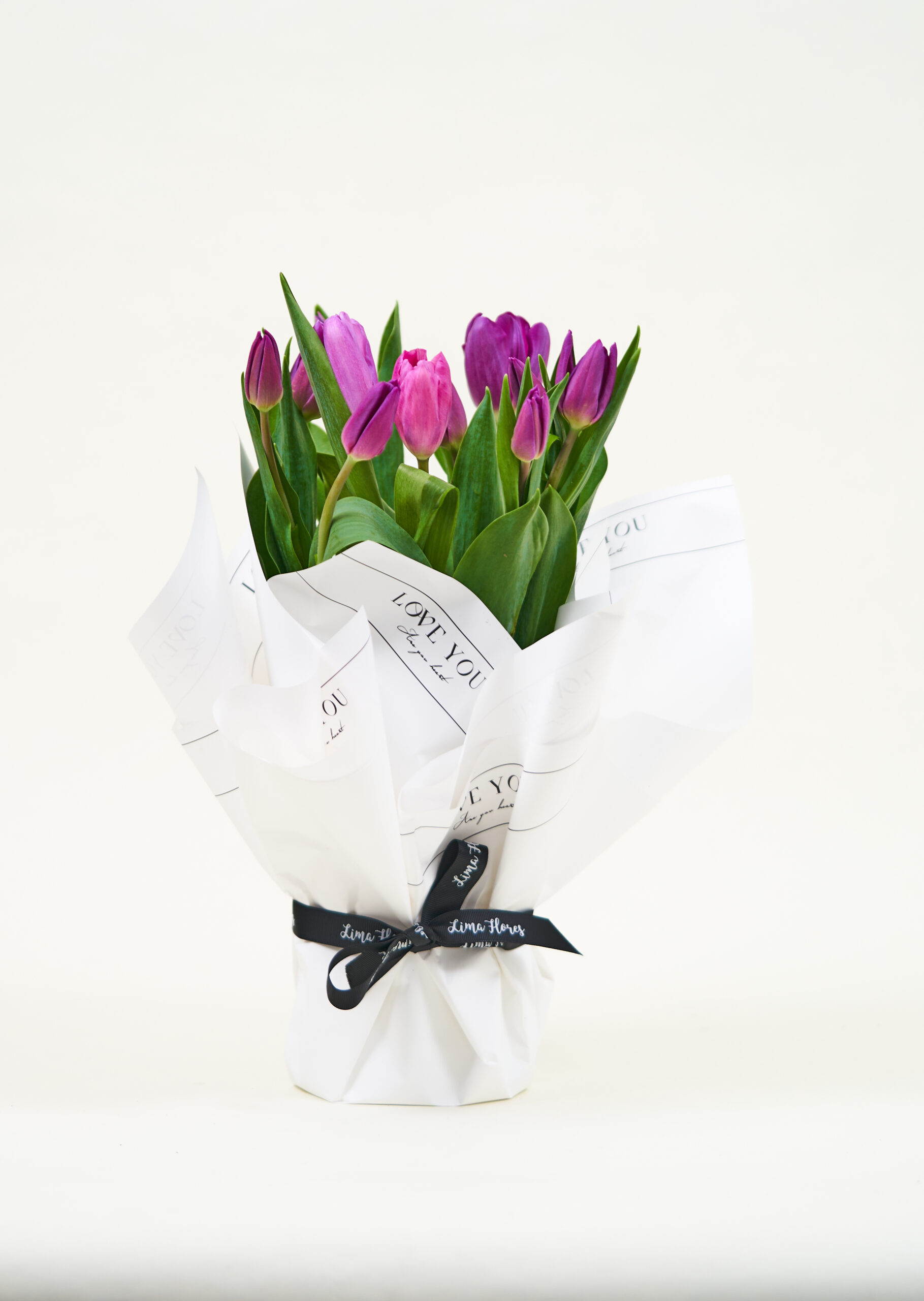 Florero de 10 tulipanes, incluye florero de vidrio y una tarjeta de dedicatoria. Puede elegir el color de las flores.